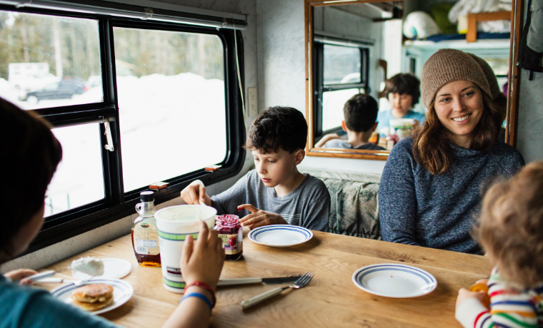 Pancakes sizzle on the tiny stovetop while snow dumps outside the trailer window and avalanche bombs blast in the distance. Phoebe and Jon Carpenter Eells, along with their three boys—Decatur, 10, Gideon, 8, and Thatcher, 2—are gearing up in the parking lot for a day of skiing at Mount Baker, Washington. Just like they do nearly every weekend during the winter.
