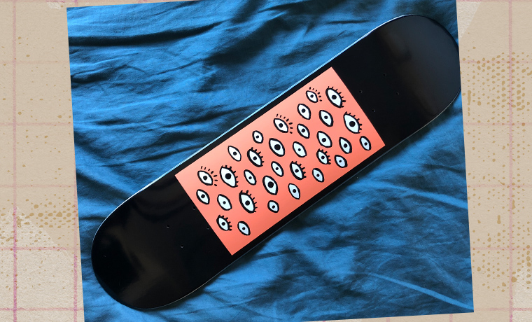 It was based on the Ballard mural I made. I thought it was interesting when everyone was masked up and you could only see eyes. I was kind of focused on that as a repetitive pattern. Steve Settles (evo Assistant Skate Buyer), thought it would be awesome on a deck and asked me to mock something up.