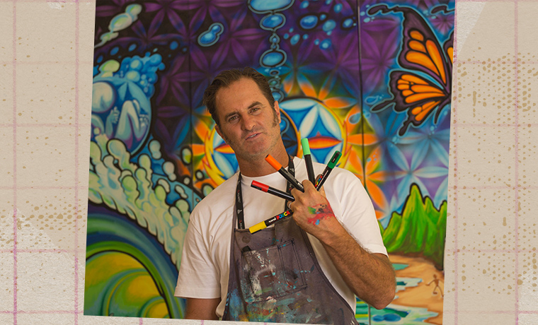 The Trip graphic was all about Alice and Wonderland - and the trip. Jimmy wanted a big, cheesy style. I can remember him saying he wanted it super happy. As for the design itself: The wave has a nice curve to it. Like the wave coming off a boat. The front design is covered with bubbles. It’s all about the water. The Trip was painted by hand with Posca pens. The original painting was 4-feet tall. I also did the lettering by hand. What’s great is that this is the board that a lot of people used when they first got into wakeboarding. And it brings back great memories for them - all the good memories they had out there riding the board.