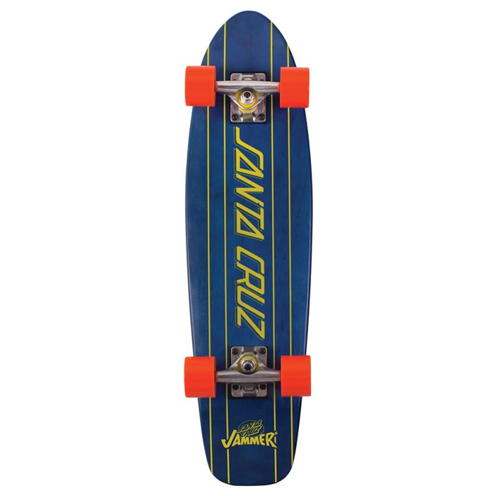 Santa Cruz Jammer Strip Longboard Complete: Classic blue stain and hot yellow pin stripes assist the Santa Cruz Jammer Strip Longboard Complete in being the most classically cool cruzer out.