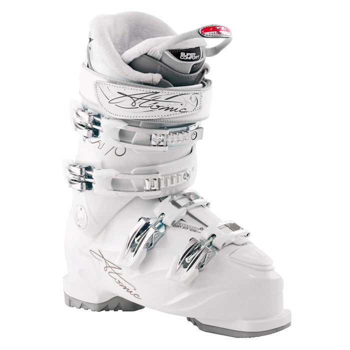 Atomic M Tech 70 W Ski Boots - Women's 2010 24.5, White: The Atomic M Tech 70 W Ski Boots fit 30% more feet than a conventional ski boot. This is thanks to a 102mm wide last and the adaptive fit system. Featuring a soft flex and the Asy Super Comfort Fit liner, the Atomic M Tech 70 W Ski Boots are designed for long, comfortable days on the slopes.