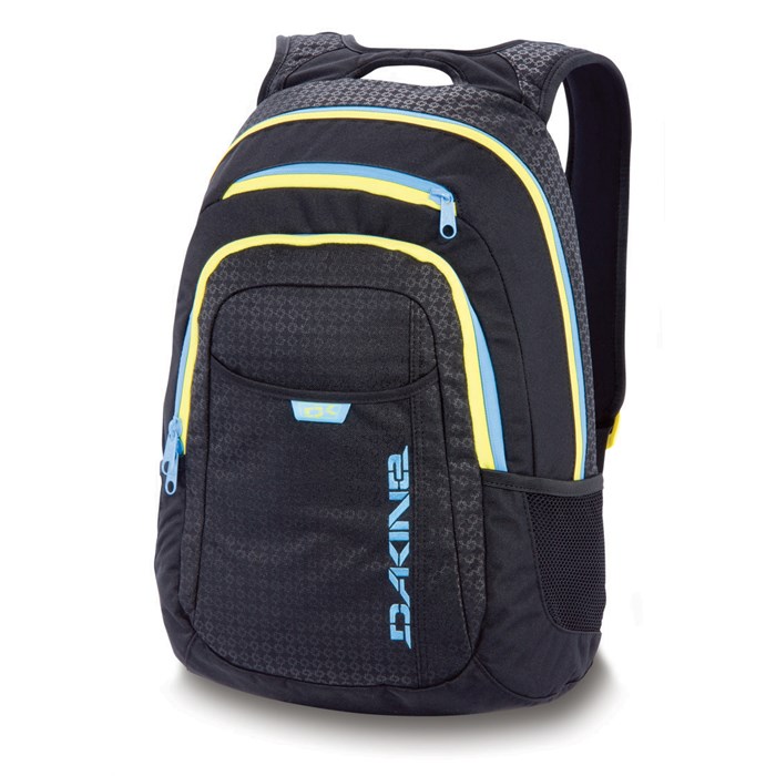 The DaKine Factor Laptop Backpack has an internal padded laptop sleeve, organizer pocket, mesh side pockets, and a fleece lined sunglass pocket.