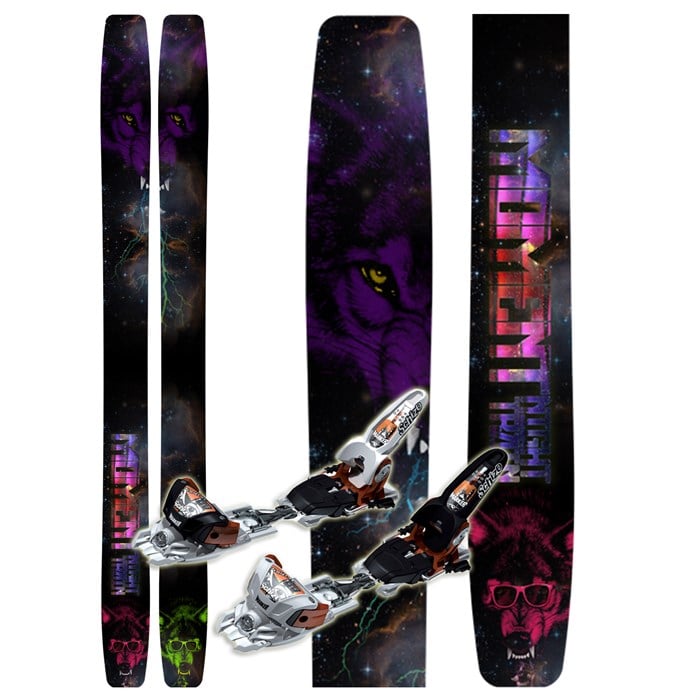 Moment Night Train Skis + Marker Schizo 16 Bindings - New Demo 2010: The Moment Night Train Skis are the one-ski-quiver. Since the creation of super sidecut, twin tip, ultra fatty and now rockered skis—you’ve got nine pairs of sticks hanging in the garage just to get through a season. Your collection might start gathering some dust because the Moment Night Train Skis excel in absolutely every snow condition. It’s the expert-of-all-trades—power, hardpack, and park. You’ll need to ski it to believe it.