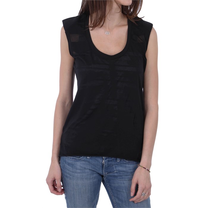 Quiksilver Rib Cage Top - Women's: Don’t get burnt out on your closet this season. Make a great addition to it with the Quicksilver Rib Cage Top. This sleeveless scoop neck tee features a awesome Quicksilver Burnout graphic, a shirttail hem and shoulder pads, making it perfect whether you are hanging out or going out.