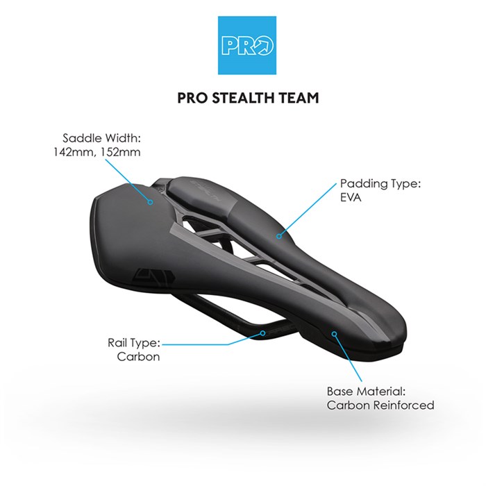 The PRO Stealth Team Saddle combines aerodynamic optimization with anatomic relief through its distinctive snub-nosed design and pressure-reducing central recess. Built with carbon rails, a carbon reinforced polymer base, and strategic EVA padding, this performance perch keeps you comfortable in aggressive riding positions without adding uneccessary grams to your bike.