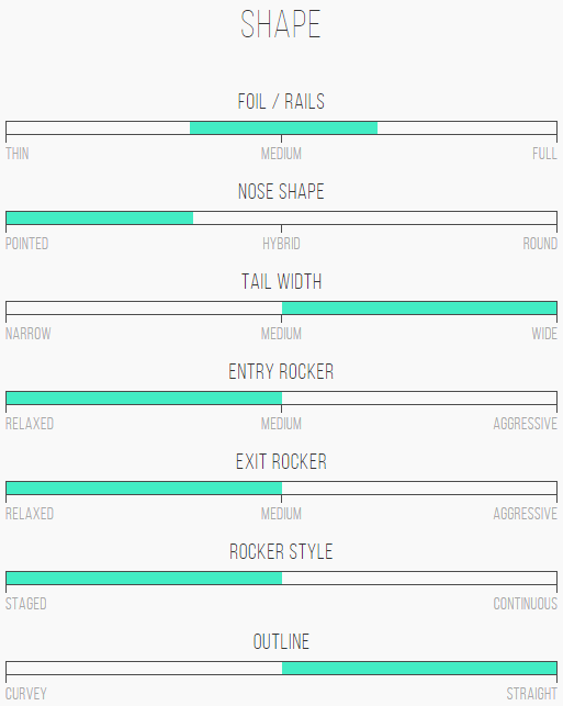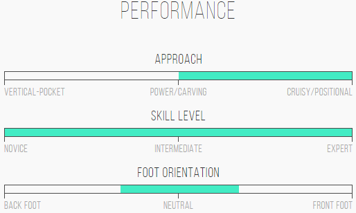 Concave – Flat, racy entry and center rocker, with ample curve out the tail for tight transitions and airs. A generous single concave runs the whole length of the board, with a slight double within the single between the fins, and just a little vee to provide kick off the tail.
