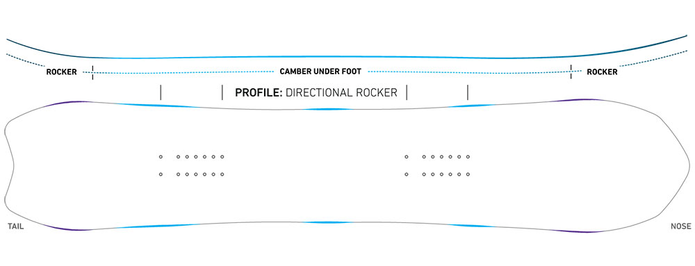 Directional Rocker – A hybrid rocker/camber flex pattern defined by more tip rocker then tail rocker and camber between the bindings. The rockered tip floats the board’s nose and improves maneuverability while the camber underfoot provides edge hold and response. A slightly rockered tail maintains the power and stability of a traditional board but helps keep the tail catch-free initiating turns and landing switch.
