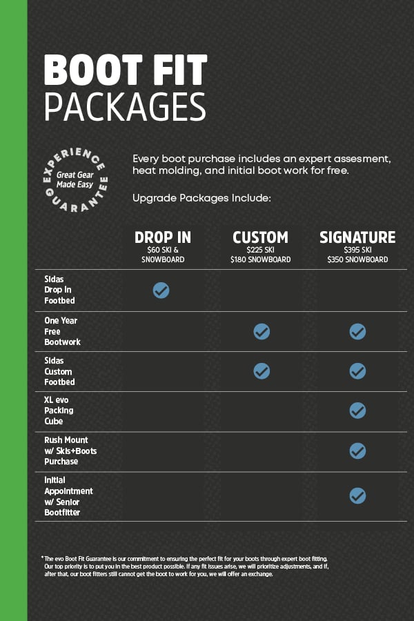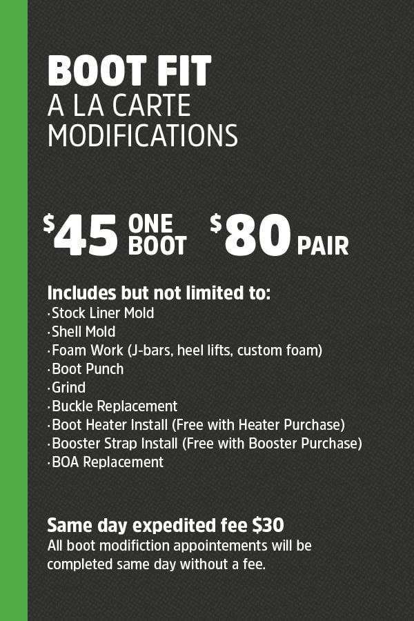 Included bootwork is specific to your respective evo Boot Fit package. All boot services, such as: Boot punching and grinding, liner molding, footbed posting, accessory installs and additional fitting materials are available.