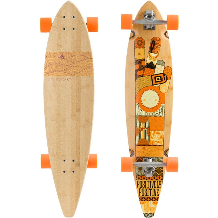 Gold Coast The Origin Longboard Complete: Designed specifically with a drifter shape for those of you who have a tendency to fantasize about smooth pavement and a deserted boardwalk you can cruise all day long. Over-sized, gummy wheels are packaged with A7 bearings to give you a swift-yet-smooth ride that's balanced by the loose, mellow feel of the reverse-pivot trucks.