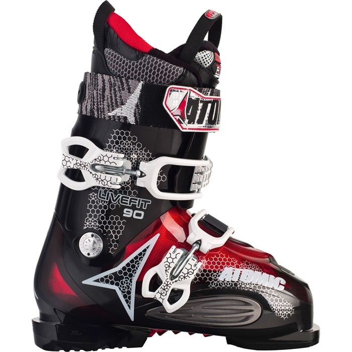 Atomic LF 90 Ski Boots 2012: The first ski boot capable of instantly adapting to the shape of the foot, the Atomic LF 90 Ski Boots can expand within a 102-106mm fore foot width. This is made possible by the instantly expanding Live Fit zones integrated into the shell that shape to your foot while still providing support. With a flex of 90 and firm heel support, the Atomic LF 90 Ski Boots provide excellent balance and comfort, allowing for especially effortless skiing. Two extra-wide aluminum buckles make the boot easy to put on and provide firm support.
