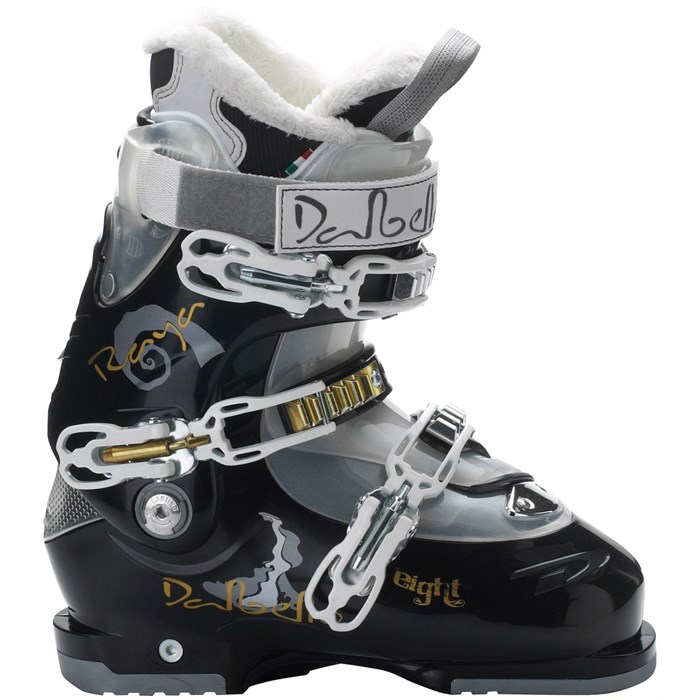 Dalbello Raya 8 Ski Boots - Women's 2011: Developed for athletic intermediate skiers, The Dalbello Raya 8 Ski Boots feature all the essential fit and technology of the Raya 10 in a lightweight design. Featuring TRUFIT custom fit comfort and a special women's-only cuff, the Raya 8 is a smooth flexing, versatile performance ski boot. The Dynalink rear foot retention system ensures proper fit and foot retention as well as a ramp angle inclinator for those ladies who need a little help getting over the front of their skis. And at 103mm at the ball of the foot, there are few feet that the Raya 10 cannot fit. Cruise the mountain in complete comfort and style with the Dalbello Raya 8 Ski Boots!