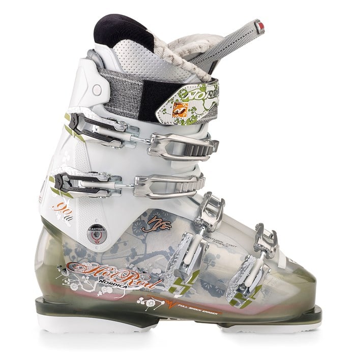 Nordica Hot Rod 9.0 W Ski Boots - Women's 2012: The Nordica Hot Rod 9.0 W Ski Boots are all-mountain boots for women with somewhat wider feet who require a roomier instep but don’t want to sacrifice on performance. All-mountain performance combined with game improvement Natural Foot Stance (NFS) technology offers up a great combination for taking on the entire mountain and advancing your performance to the next level.