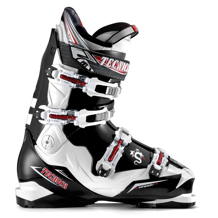 Tecnica Phoenix 90 Ultrafit Ski Boots 2010: New for 2010, Tecnica’s Phoenix boot offers the performance of the Dragon line with improved comfort and fit. A larger internal volume means more cushioning in the sole, while the unique Delta Force System provides a choice of soft or stiff settings. An AVS sole provides shock-absorption to keep your landings smooth, while a non-slip base keeps you stable while cruising around the lodge. The UltraFit lining is moldable for a custom fit, and fur lining keeps your feet toasty in even the coldest alpine conditions