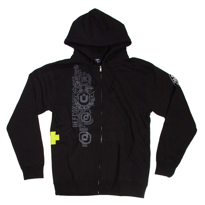 Defcon UNKL Co-op Zip Hoodie: Defcon paired up with UNKL to bring you a hoodie like no other. It has a zipper, some pockets and a hood. It's black with a design and it will make you a better snowboarder. And a better person.