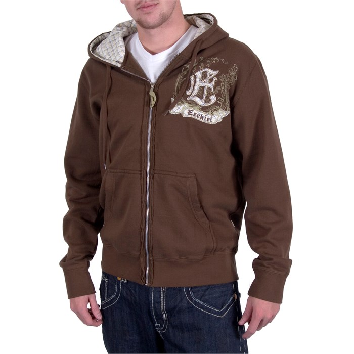 The Ezekiel Roman Fleece zip up hoodie is all around solid. The plaid cotton poplin hood lining is an incredible touch. Chest appliqué, embroidery and the raw edges really make this Ezekiel hoodie unique.