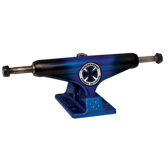 Independent 139 Reynolds Pro V Skateboard Truck 2010: Get amped on the new Pro V Series, inspired by Independent’s Stage V Anodized colors from the late 80s. With colorways from Andrew Reynolds, Eric Koston, Geoff Rowley, and Chris Haslam as well as a team colorway, rocking one of these designs is crucial to killing it street or vert. The Independent 139 Reynolds Pro V Skateboard Truck has an ill sapphire to black fade, which consists of a hand coated black fade on top of a transparent color coat, with matching logos, hardware, and cushions. This truck is the epitome of perfection, featuring legendary fast-action independent geometry and a classic look featuring 356 T6 aluminum hollow body hanger and base plate with 4140 chromoly steel axles and grade 8 kingpin – guaranteed for life!