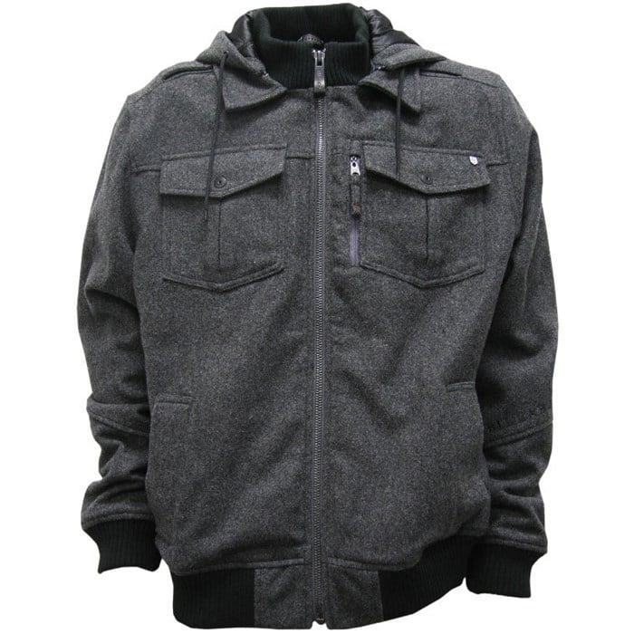Billabong Tarif Bomber Jacket: A wool blended bomber style jacket with removable hood. The Billabong Tarif Bomber Jacket features sweater rib cuffs and hem, front chest pocket, well pockets at bottom, and metal badging.