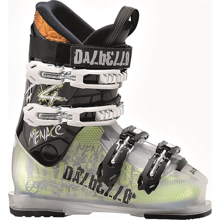 Dalbello Menace 4 Ski Boots - Youth 2012: The Dalbello Menace 4 Ski Boots have a super lightweight 4 buckle overlap design developed for improving freeride and freestyle skiers. To match the freestyle design, the Menace features killer freestyle coloring thanks to the high tech, transparent shell that lets you see the asymmetric orange and green liners on the inside. All around, the Menace 4 is quick and responsive with versatile fit and performance.