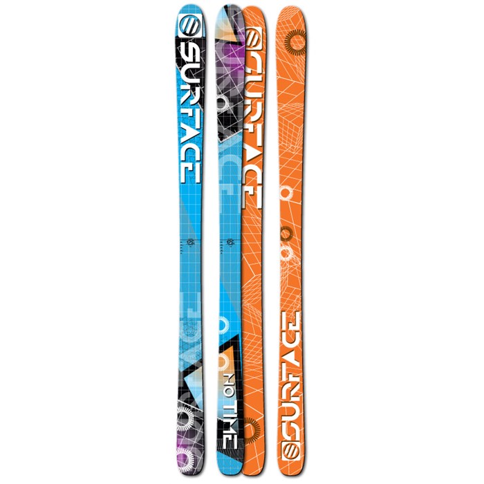 Surface No Time Skis 2011: Up late, sleep in, copes, bomb drops, handrails, PC, park booters, taps, Govy, generators, lights, shovels, tow-ins, Breck, edits, webisodes, chat rooms and Facebook…ah, the life of a park skier. The Surface No Time Ski is the budget friendly park ski for 2011. Slight early rise in the tip and tail make it easy to press, butter and lock onto handrails without the catch of a regular cambered ski.