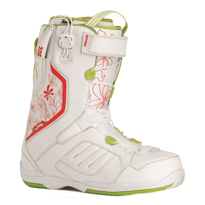 Deeluxe Alpha Lara CF Snowboard Boots - Women's 2009: These days it's all about how fast your laces are. But what's the point of lacing faster if you sacrifice a good, tight fit? Deeluxe is stepping up the lacing game with their Sectional Control Lacing, which offers lightning fast tightening in three separate zones. With the Alpha CF Boots, you get the perfect fit of the SCL lacing system with the Deeluxe Powerstrap and girls' specific back cuff for solid calf hold to eliminate blistering rub and calf bite. The CF liner gives the Alpha Boots a big comfort boost with its cushy foam and advanced footbed design. Grab the Deeluxe Alpha CF boots and shred in comfort with confidence.