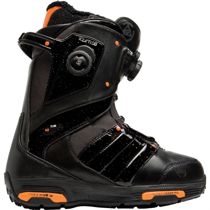 K2 T1 DB Boa Snowboard Boots 2010: When you’re able to beat everyone to first chair for those sweet freshies, or to the park before the après lunch crowd hits, you can thank the combination of K2’s BOA CONDA Lacing System and the external Boa H2 Coiler. The K2 T1 DB Boa Snowboard Boots also have super light Vibram outsoles with Intuition liners, so that you can have a boot that is durable, light, and extremely powerful.