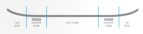 Flat Top – A flat profile between the feet means stability, better balance, and continuous edge control. The tip and tail kick up with an early rise outside the feet for the catch-free, loose feeling you’d expect from rocker.