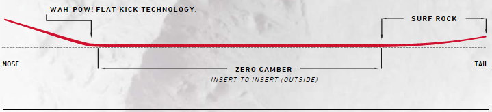 Party Profile – The Party Profile features an easy to ride zero camber midsection with a kinked flat kick nose and a chilled out mellow tail. This allows the nose to rise above the slush, pow, or chunder as you lay care-free carves on your way down the hill.