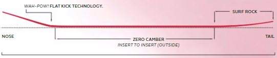 Party Profile – The Party Profile features an easy to ride zero camber midsection with a kinked flat kick nose and a chilled out mellow tail. This allows the nose to rise above slush, pow, or chunder as you lay care-free carves on your way down the hill.