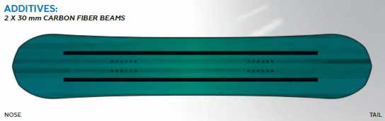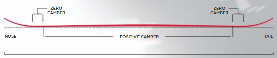 New Age Profile – This freestyle camber configuration zeros out a traditional camber approach 4cm before the end of the sidecut. The small zero camber sections provide a more controlled ride while retaining the response and power of a cambered board.