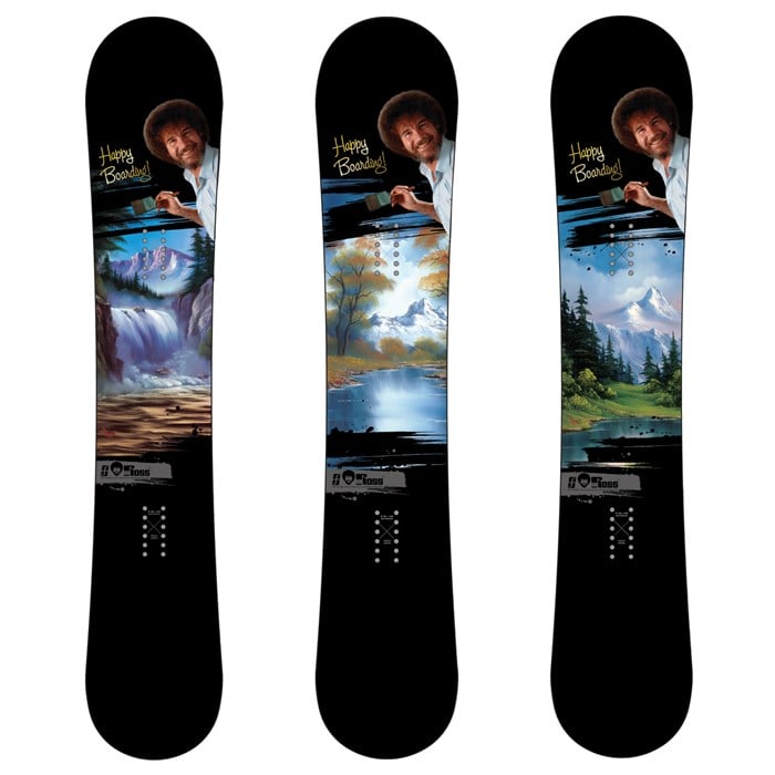 Forum Scheme Bob Ross Snowboard 2010: Happy little tree runs. Happy little landings. Happy little slashes. The Forum Scheme Bob Ross is a throwback to a time before royalty checks, autograph sessions and the X Games. A time when Saturday mornings were about sugar cereal, five channels and happy boarding. High-resolution landscapes from the private Bob Ross collection turn a blank canvas into a piece of rec room art, while easy cruising geometry keeps both powder hounds and park rats on cloud nine. Bob was the original DIY artist and the Scheme is no happy little accident.