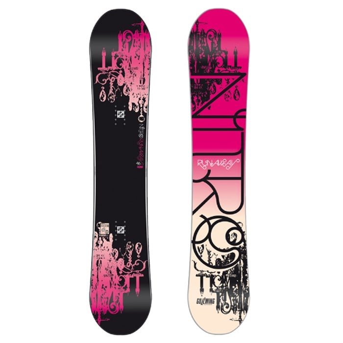 Nitro Runaway (Black) Gullwing Rocker Snowboard - Women's 2011: The Nitro Runaway Gullwing Rocker Snowboard is built for the female rider that is a park slayer. The Powercore II for strength and pop, combined with Bi-Lite laminates make it light and forgiving. The twin shape and urban flex make this board a perfect fit for any female that wants to get technical, yet still keep it fun. The Gullwing camber places the camber under the foot for stability towards the tip and tail and reverse camber between the bindings to relieve pressure on the contact points. It will amp up your confidence when learning new tricks this season.
