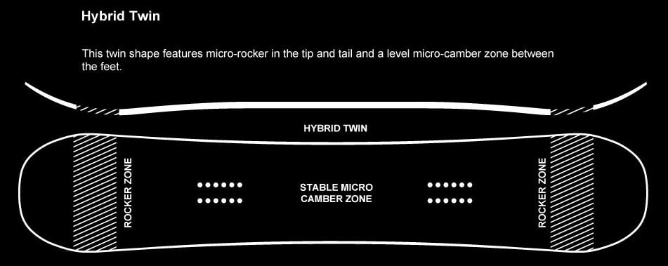 Hybrid Twin – This twin shape features micro-rocker in the tip and tail and a level micro-camber zone between the feet.