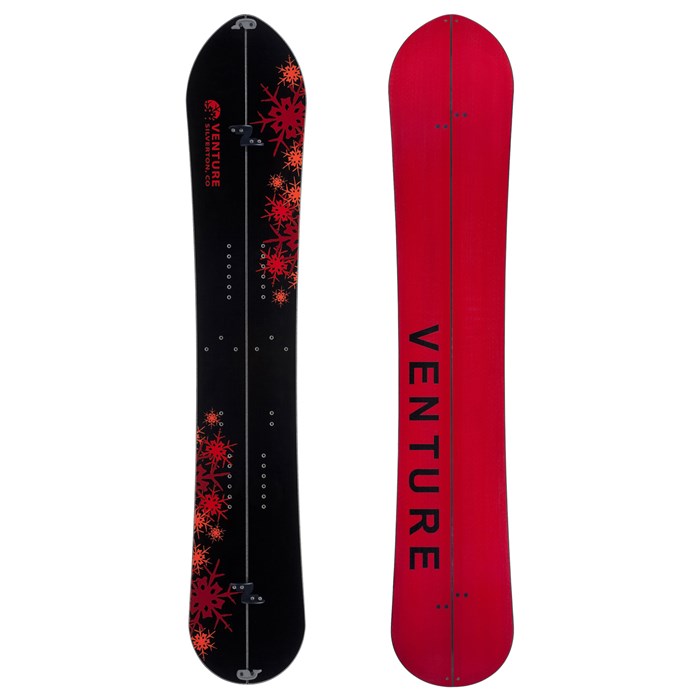 Developed in conjunction with Silverton Mountain and tested in Colorado's rugged San Juan Mountains, The Ventures Storm Splitboard craves big lines and burly terrain. It’s chatter proof when bombing open steeps, but agile enough to navigate tight trees and narrow chutes without flinching. The Storm has a moderate taper and a softer nose to provide float in untouched powder fields, while a stiffer midsection and tail lend stability and control in unpredictable big mountain conditions. The surf inspired nose and rockered shape keep you from augering into the deep stuff. No wonder the splitboard version won Backcountry Magazine's 2010 Editor's Choice Award and the solid was named a Snowboarder Magazine "Best of Test" by Rocky Mountain retailers.