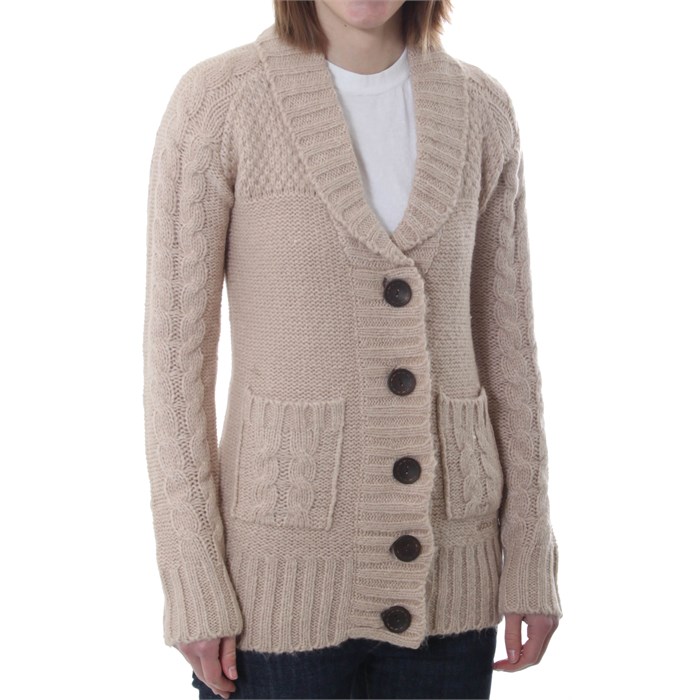 Billabong Dempsey Sweater - Women's: Ease into the warming arms of the Billabong Dempsey Sweater whenever the chilly weather gets rough. This sandy brown wool-blend sweater has sweet retro stylings that are pretty much working towards being the sweater of the year! Snuggle up with fold-over collar and cable-knit front pockets.