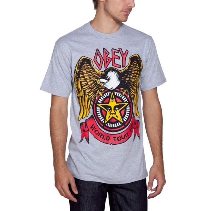 Obey Clothing Thrash Eagle Basic T Shirt: Feel the bass pulse through your veins as the guitar solo melts your face. Inspired by metal and the World Tour of ’89, throw up the horns for the Obey Clothing Thrash Eagle Basic T Shirt.
