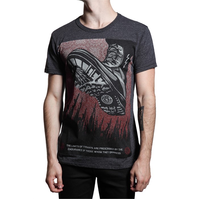Obey Clothing Tyrant Boot Tee: Though the print reveals a large boot stepping onto scores of bayonet rifles, the text at the bottom of the Obey Clothing Tyrant Boot Tee makes you want to conform to nothing. “THE LIMITS OF TYRANTS ARE PRESCRIBED BY THE ENDURANCE OF THOSE WHOM THEY OPPRESS.” Whoa.