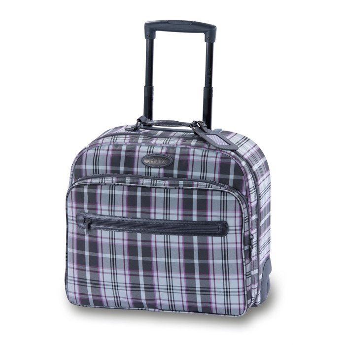 Wheeled carry on style, Padded vinyl handle and vinyl trims, Interior elastic straps to hold clothing in place, Includes nylon bag, eyemask and one liter clear toiletries bag.