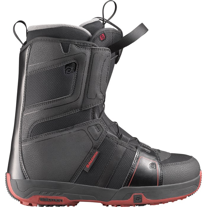 The Salomon Echelon Snowboard Boots are accented with red throughout the boot, on the outsole, and on the Salomon logos creating a sleek effect.