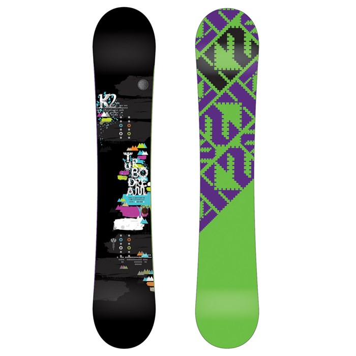 K2 Turbo Dream Snowboard 2009: A combo of bright retro and ancient Incan warrior symbols fuse together to represent this true all mountain snowboard. The K2 Turbo Dream Snowboard combines a New ICG 10 glass and the WH3 lightly honeycombed core to create one poppy warrior who is ready to take on any all mountain course. An every Terrain Rocker and Hyper Progressive shape keeps the Turbo Dream’s skills diverse, while the combo of Hybritaper tip tech, and poppy Carbon Matrix 1 torsion forks give the K2 Turbo Dream Snowboard the light stiffness a park board needs. Prepare to go anywhere, dream big when you ride the Turbo Dream Snowboard by K2.