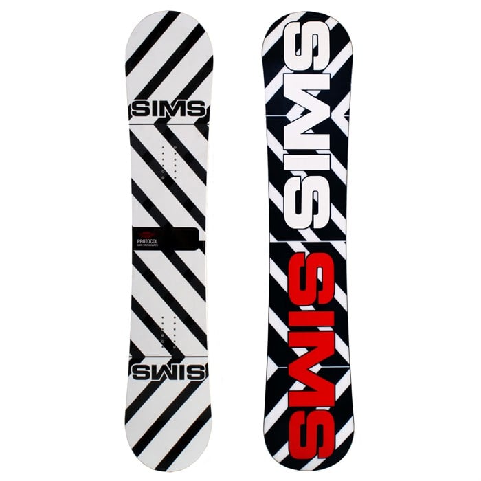 Sims Protocol Snowboard - Demo 2008: The Sims Protocol snowboard features a twin-tip design with reverse camber and a rocker technology for increased float in powder and effortless turning. It has a light and strong poplar core with 1" stringers for maximum comfort, while tri-axial fiberglass helps the board maintain its original flex characteristics. Rubber foil dampeners provide a smooth ride and increase bonding strength between the edge and sidewall.
