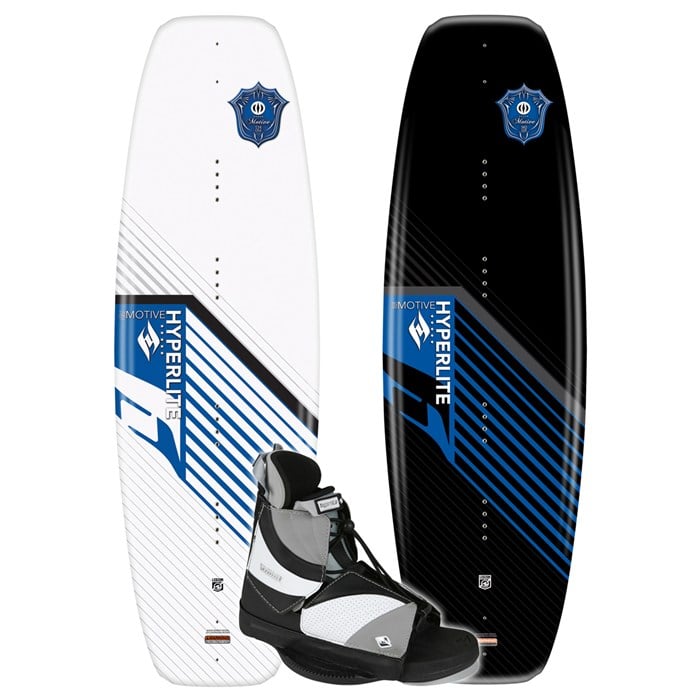 Hyperlite Motive Wakeboard + Vario Boots 2009: The Motive is a board preferred by beginner and intermediate riders who like the flowing feel of the original free ride series. The Motive provides a mellower turn with a smooth lift off the wake and predictable landings. The board also comes equipped with molded in fins for added stability and control. Slap a pair of Hyperlite’s time tested Vario Boots on the Motive and you've got a great setup for the beginnings of many wakeboard shred sessions.