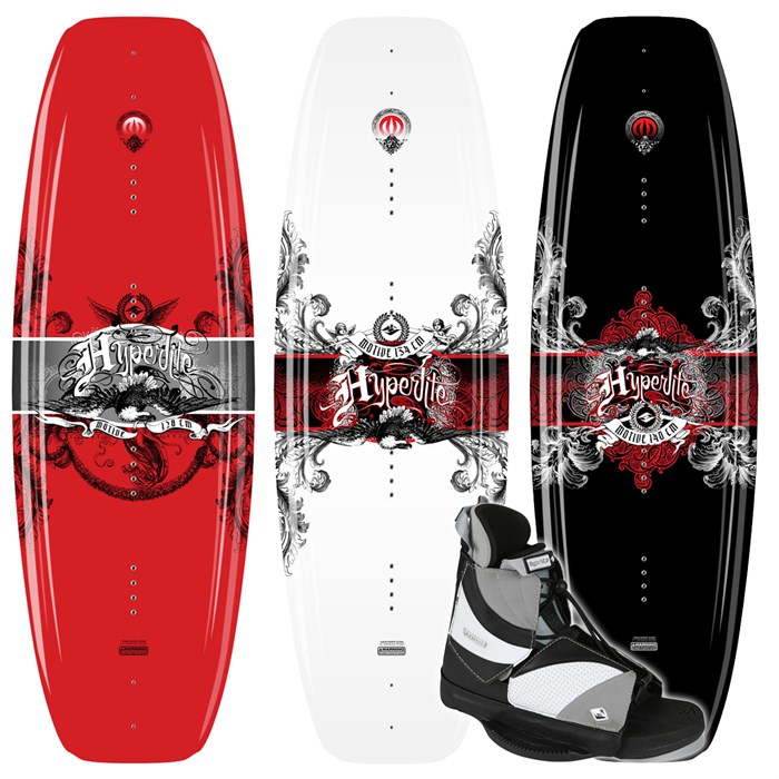 Hyperlite Motive Wakeboard + Vario Boots 2008 : The Hyperlite Motive Wakeboard and Vario Boot package is great for any beginner to intermediate rider. The Hyperlite Motive Wakeboard gives the feel of the original freeride series with a more mellow turn and smooth lift off the wake. The Hyperlite Vario Wakeboard Boots are made with the new rear flex zone and quick adjust elastic laces which make for a nice snug fit. These boots are great because they provide a nice fit to a number of riders. The Hyperlite Motive Wakeboard and Vario Boot package is perfect to have aboard because it works well for a number of different riders and a variety of skill sets.