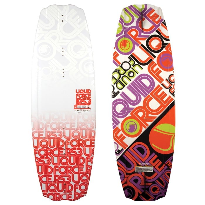 The Liquid Force PS3 Wakeboard has a three stage hybrid rocker with a straighter curve through the center for consistent edging and speed into the wake. The rocker makes for exaggerated kink out of the tips, smooth transitions into the tail section, and increased trajectory off the wakes. The Tip exiting slots channel away water in the proper direction to generate speed and keeping you locked in on approach to the wake.