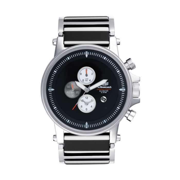 Case: Stainless steel, 48mm wide. Band: Stainless steel linked between acetate, 30mm wide