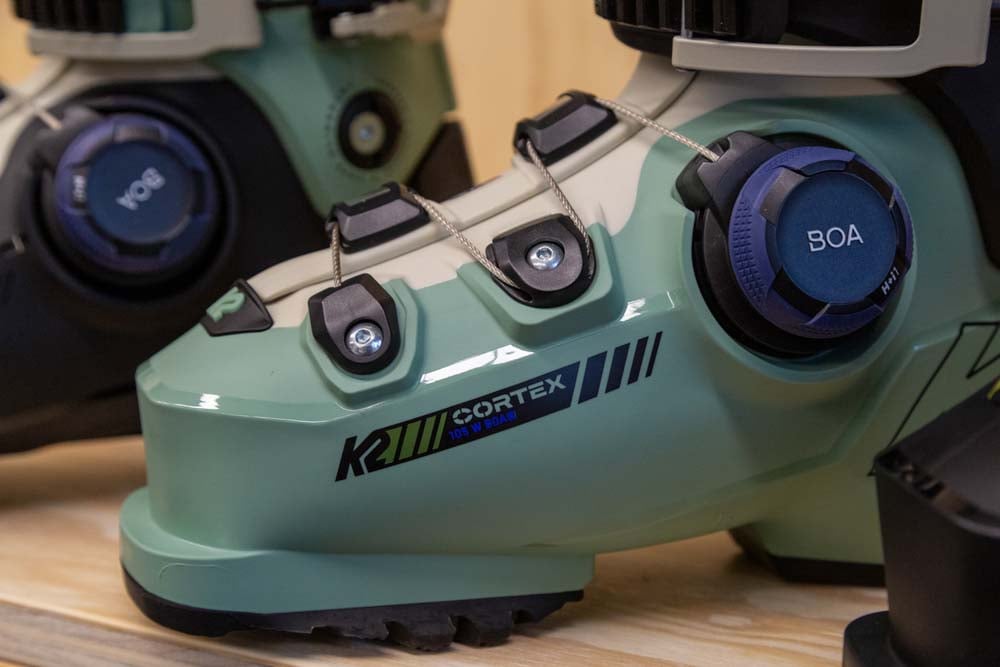 Danielle: The Cortex 125 is a low volume boot with a 98mm last and 125 flex, one of the stiffest flexes available for women. The most striking feature of the Cortex 125 is the Zonal (or double) BOA closure system. K2 claims this distributes pressure evenly across the foot and calf, preventing hotspots and pain points. Additionally, it is said to better lock in skiers’ heels by uniformly wrapping the foot.