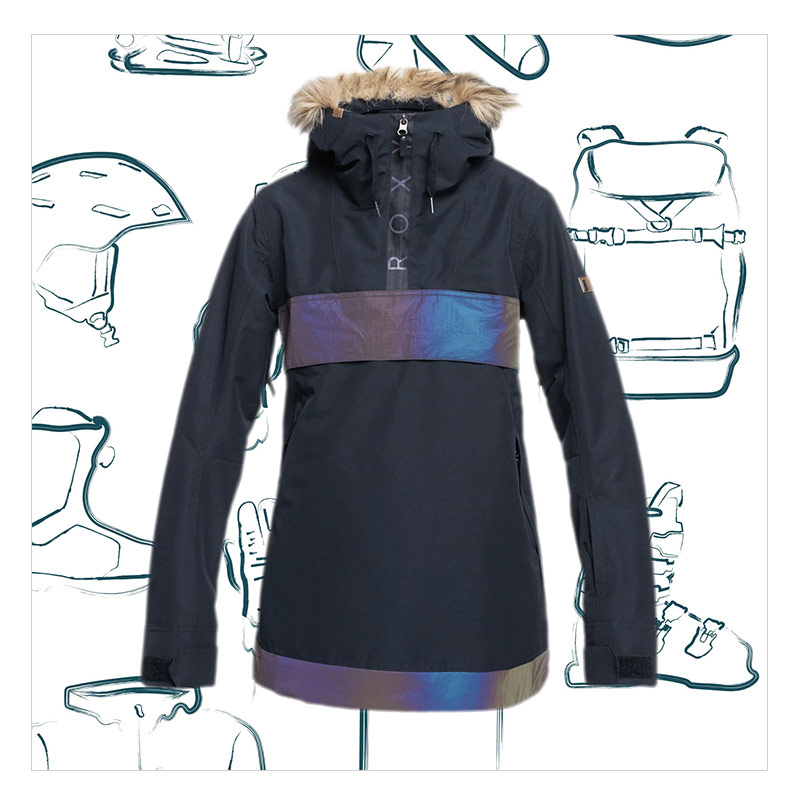 This is my first pullover style ski jacket and it's so cozy! I was impressed with how lightweight it was. I’ve had insulated jackets from Roxy in the past and this one feels much lighter than my previous insulated jacket. Even though it felt lighter, it still kept me warm on and off the mountain. I had expected to struggle getting in and out of the pullover style jacket, but was really impressed with how much easier it was with the long side zipper. Another surprise was how well the hand warmer pockets worked. My hands are always cold, but they stayed warm in these nifty lined pockets. The inner hand cuffs are a fantastic feature. I’ve had them on previous jackets and they’re my favorite! It feels almost like an extra glove over your hands, which also helps keep them warm. The chest pocket is hidden for a sleek look, but could still hold my phone and snacks! I was able to fit my helmet in the hood comfortably and turn my head to the sides without any of my peripheral view being blocked. On top of all these great features, the faux fur trim on the hood (which is removable) and holographic trim on the front give this jacket style. I would recommend this jacket to anyone who wants to be warm, functional, and fashionable on the mountain.