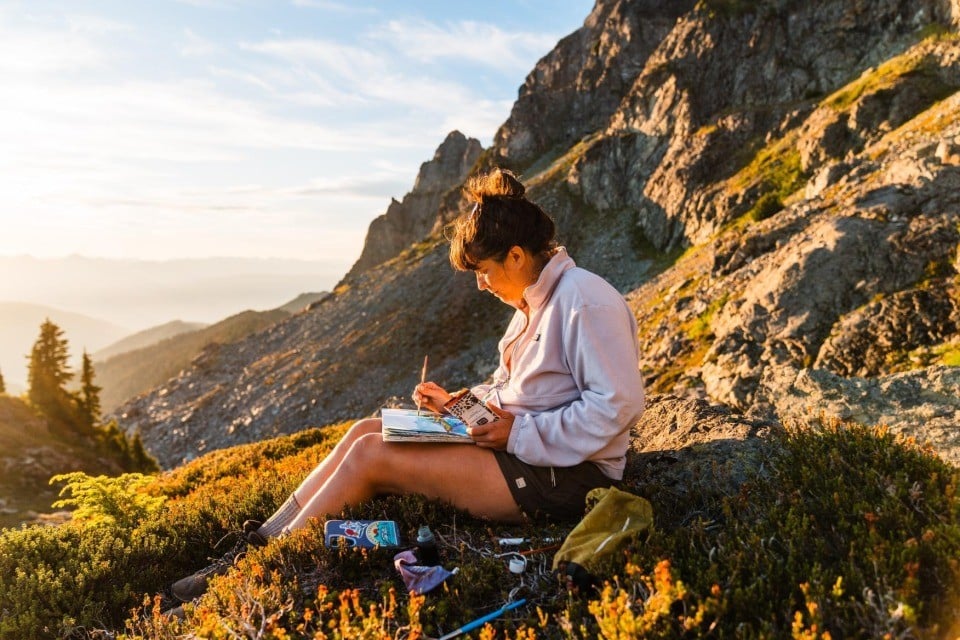 Art by Katherine Scheulen – Katherine Scheulen is a Seattle based artist who feels most at home with a paintbrush in her hand or a mountain beneath her feet. A skier, hiker, and mountaineer, she is also a member of evo's Women/Non-Binary Employee Resource Group, whose vision brought this collaboration to life. Katherine poured her love of nature and watercolor into evo's first ever SheJumps collection. We hope it inspires more women to jump of their comfort zone and get outside!