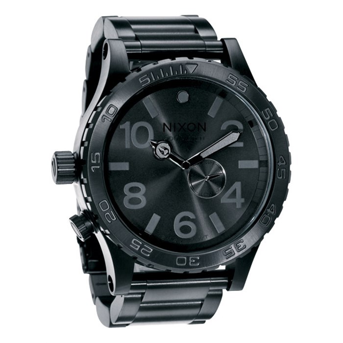 The Nixon 51-20 Watch has a single face with a tide subdial, external rotating bezel with countdown timer